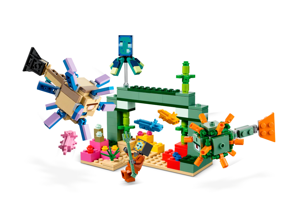 As crianças enfrentam um desafio repleto de ação nesta envolvente missão de Minecraft ambientada no fundo do oceano. Primeiro, elas devem construir um monumento em meio ao recife de coral colorido. Há um tesouro escondido para encontrar, mas também 2 mobs icônicos de Minecraft: um guardião e um velho guardião, que estão determinados a detê-las. Armadas com um tridente e assistidas por 3 axolotls, as crianças devem repelir os perigosos mobs para continuar sua missão. O perigo extra vem de um atirador com mola que lança um míssil com um movimento da cauda do maior guardião. Com possibilidades ilimitadas de brincadeiras criativas, esta aventura com peças LEGO oferece às crianças toda a emoção do jogo Minecraft.