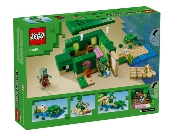 Os jogadores constroem uma casa Minecraft em forma de tartaruga com janelas, lanternas, porta, cama, mesa, mesa de trabalho e fornalha. Um teto removível permite fácil acesso ao interior. Do lado de fora, há uma área de praia com cana-de-açúcar, ovos de tartaruga e uma jangada de bambu com remos. Existem figuras e mobs familiares do Minecraft: um guerreiro de pele de tartaruga com pele de tartaruga e capacete, um afogado com um tridente, uma tartaruga mordiscando ervas marinhas e 3 filhotes de tartarugas. Outros acessórios deste brinquedo para jogadores incluem uma luneta e um mapa. Os fãs de jogos de ação, construção criativa e cuidados com os animais vão adorar este brinquedo versátil. Para diversão digital extra, o aplicativo LEGO Builder permite que os construtores aumentem o zoom, girem modelos em 3D e acompanhem seu progresso.