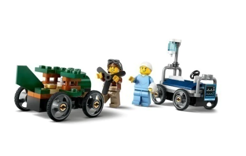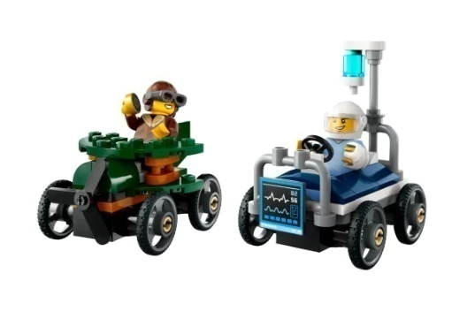 Surpreenda seu jovem fã de corrida a partir de 5 anos com o LEGO® City Pack de Carros de Corrida Avião vs. Leito de Hospital.