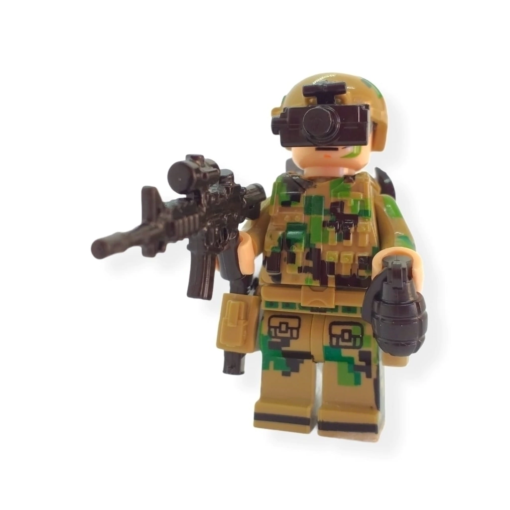 01 MINIFIGURA MILITAR COMPATÍVEL LEGO + CONJUNTO DE ACESSÓRIOS DIVERSOS E ALEATÓRIOS: (CANTIL, FACA, FACÃO, MACHADINHA, GRANADA, BINÓCULO, CHAVE INGLESA, MARTELO, ALICATE DE CORTAR CERCAS...)